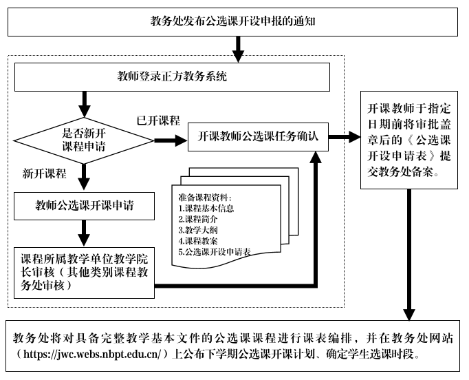 2.教务处(招生办)将对具备完整教学基本文件的课程进行课表编排,于2023年1月9日前确定并在教务处网站(https://jwc.webs.nbpt.edu.cn/)上公布下学期公选课开课计划。