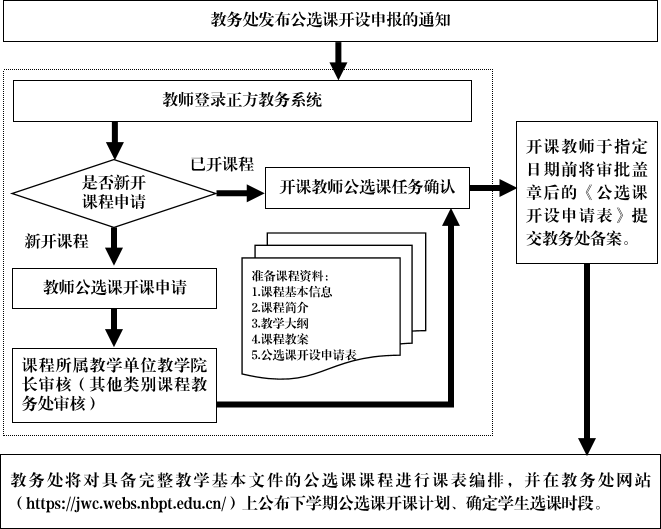 2.教务处(招生办公室)将对具备完整教学基本文件的课程进行课表编排,于2024年7月31日前确定并在教务处网站(https://jwc.webs.nbpt.edu.cn/)上公布下学期公选课开课计划。