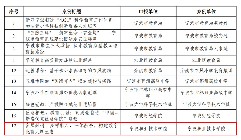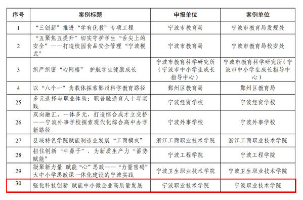 近日,宁波市教育局会同市教育学会组织开展的宁波市第六届教育改革创新典型案例评选结果揭晓,17项标志性成果典型案例、30项重大改革举措典型案例、18项惠民实事典型案例、34项优秀案例入选。我校共有2个案例入选典型案例,总数位列宁波高校第一。